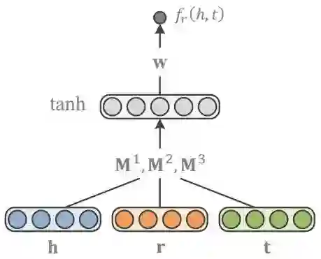 通过这种方式,实体在不同关系下可以有不同的表示,最后的打分函数定义为:
