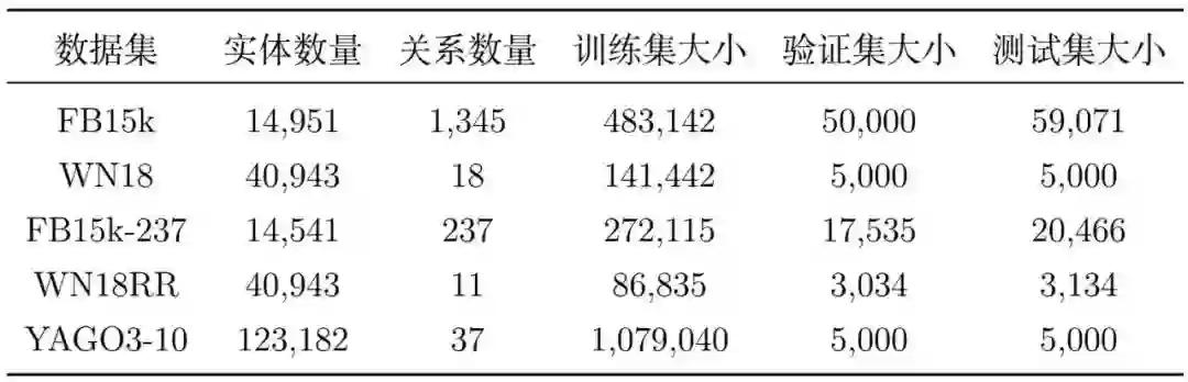 知识图谱补全任务上,目前常用的数据集有 WN18RR, FB15k-237 和 YAGO3-10 等,它们分别是 WN18,FB15k 和 YAGO3 的子集。WN18 和 FB15k 数据集早期被用于知识图谱补全任务,但是后来有研究者发现这两个数据集存在一定的测试集泄漏问题,在这两个数据集上,简单的基于规则的方法就能够达到先进模型的效果,所以 WN18 和 FB15k 渐渐不被研究者使用。表1显示了知识图谱补全数据集的具体统计信息,其中数据集大小指的是三元组的数量。