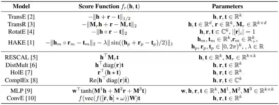 同时输入神经网络,来判断三元组的打分。早期的工作如 MLP [9] 使用全连接神经网络来对给定的三元组进行打分。近年来,ConvE [10] 等工作使用卷积神经网络 (Convolutional Neural Network) 来定义打分函数。由于知识图谱是一种图结构的数据,近期也有一些工作将图神经网络 (Graph Neural Network) 应用于知识图谱嵌入。