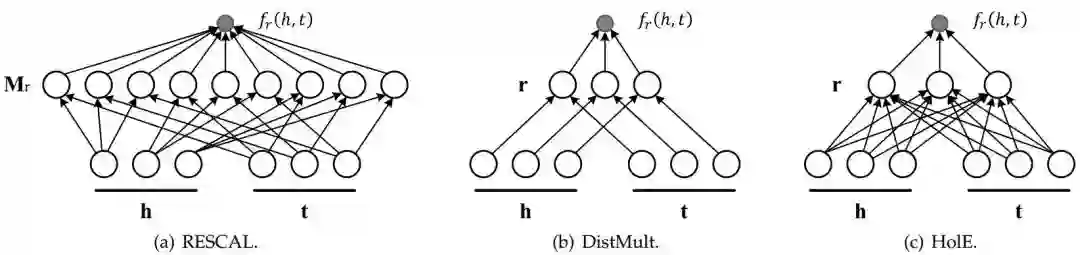 可以看作是 的双线性函数,其中矩阵 。为了降低计算量,DistMult [6] 将矩阵 设计成对角矩阵,HolE [7] 则使用循环相关运算 (Circular Correlation Operation) 来代替中间的关系矩阵乘积。这些方法计算方式的示意图见图5。