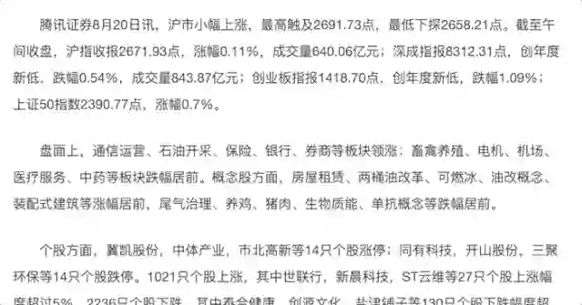2018年8月20日11:32分,上午股市刚刚收盘2分钟,腾讯证券就发表了了一篇股评文章,名为午评:沪指小幅上涨0.11%报2671.93点 通信运营、石油开采等板块领涨,全文949字。