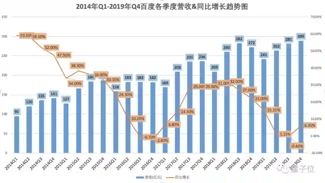 2019年第四季度,百度总营收为人民币289亿元(约合41.5亿美元),与上年同期相比增长6%,与上一季度相比增长3%。