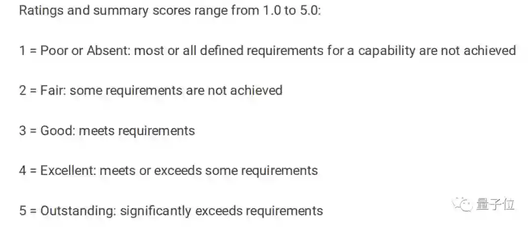 Gartner将每种功能的程度分为5个等级,分别对应1-5分,分数越高则表明实力越强。