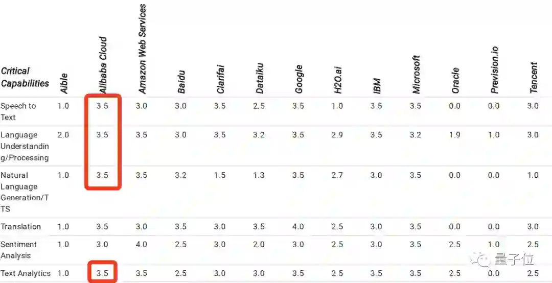 阿里在语音识别、自然语言生成/语音合成、语言理解/处理、文本分析这几项关键能力都获得了最高分。