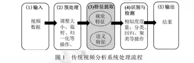 这一流程可以分为数据输入、预处理、特征提取、识别与检测、结果输出这 5 个部分, 其中, 特征提取是传统视频分析系统的核心部分。这些要提取的特征可以分为视觉特征和语义特征两大类: 视觉特征即图像通过线性变换得到的特征。例如, 颜色、纹理、形状等; 语义特征则是通过分析图像中事物与事物之间的关系, 从中提取出的对象、事件等高级概念。例如, 足球比赛的观众席上有一位球迷看起来很兴奋。显然, 这两类特征的含义不同, 因此, 对这两类特征的提取要求是不同的。根据提取特征的不同, 可将传统视频分析系统分为基于内容查询(content-based image retrieval, CBIR)的系统和基于语义查询的系统这两类。其中, 基于内容查询的系统具有代表性的有QBIC[9]、Virage[10]、PhotoBook[11]、FourEyes[12]、VisualSEEK[13]等。