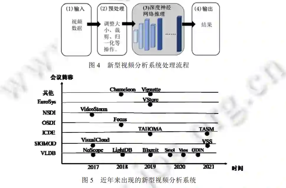 面对视频处理需求, 如何自动、高效地从视频数据中提取相应信息,是视频分析系统的关键。早在 20 世 纪 90 年代,国内外的很多公司, 包括 IBM、Virage 等, 都开发了视频分析系统进行图像检索与对象查询。本文将这些系统称为传统视频分析系统。但是, 随着视频数据的快速增长和视频分析应用需求的增加, 这些系统的不足逐渐显现, 主要表现在这些系统基于传统的计算机视觉的方法进行对象查询, 而这些对象查询所使用的特征需要人为地选择和提取。这是一种半自动的实现方式, 这种实现方式导致系统的准确度低、查询对象有限、识别能力有限。在之后的一段时间中, 视频分析系统的发展停滞不前。直到 2012 年, 在 ImageNet 图像分类比赛上, 深度神经网络 AlexNet[8]取得了当时最好的结果, 这为视频分析系统提供了新的方向。通过使用深度神经网络, 系统可以自动提取并学习对象丰富的特征, 并推理得到准确的结果。此后, 深度神经网络 (deep neural network, DNN)的种类逐渐增多, 功能逐渐多样化。更进一步地, 因深度神经网络的兴起, 以深度 神经网络为本质的深度学习方法也逐步在人工智能的多个领域中得到广泛应用。时至今日, 国内外研究人员仍致力于使用深度学习方法来解决现实生活中的一些难题。随着深度学习日益受到广泛关注, 近年来出现了 很多基于深度学习的视频分析系统, 本文将这类系统称为新型视频分析系统。