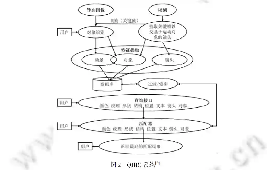 QBIC (query by image content)系统是 IBM 公司开发的第 1 个基于内容的商业化的图像检索系统, 图 2 展 示了 QBIC 系统的架构。可以看出, 该系统的处理流程符合传统视频分析系统的处理流程。它对输入的图像或者视频进行预处理后, 再提取颜色、纹理、形状等视觉特征, 然后将这些特征存储在数据库中。用户进行查询时, 该系统根据用户提供的要查询图像的特征与数据库中保存的图像的特征进行相似度度量, 最终返回匹配度高的图像作为结果。
