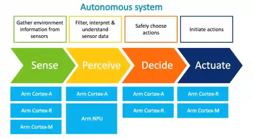 Arm CPU和其他IP,如GPU、ISP和NPU允许在整个车辆的各个系统中使用基于Arm的解决方案,Arm的合作伙伴也提供最广泛的汽车级SoC。这一系列的应用处理器(Cortex-A)、实时处理器(Cortex-R)和小型低功耗微处理器(Cortex-M)适用于自动驾驶所有阶段。随着Arm的合作伙伴将更多的计算力带到异构化SoC平台上,这将有助于满足更大的算力需求,同时降低功耗、价格、尺寸和保持良好的散热特性。