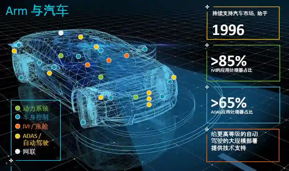 从1996年Arm正式进入汽车领域做刹车控制芯片IP开始,到如今已发展了20多年。目前在IVI领域,85%的处理器采用Arm架构;在ADAS领域,超过65%的应用处理器采用的是Arm架构。从传统的动力系统控制、底盘控制和车身控制,到现在ADAS/IVI,都有控制芯片在采用Arm的架构。所有电子器件采用通用的架构,辅以领先工具生态系统的大力支持,汽车制造商和供应商便能对硬件与软件进行快速创新。这些创新将革新安全性、降低能耗,同时提升驾车体验。