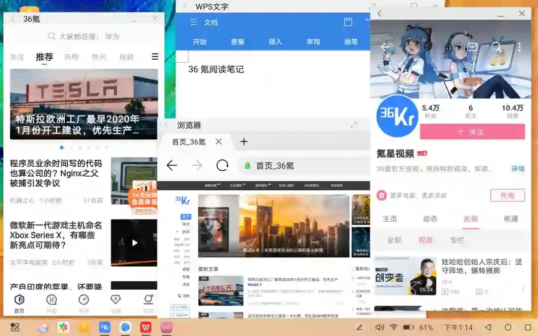 分屏模式演示屏幕截图-哔哩哔哩、36氪App与微博浮窗