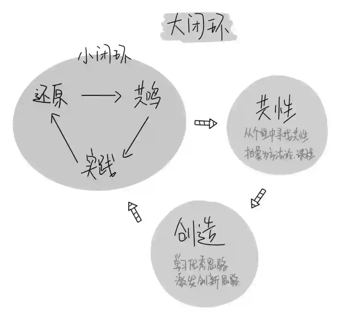 分享者还原个性的经验,学习者从个性中找到共鸣,平台从所有的分享和数据中找到用户的共性问题,提炼成方法论、组织系统化学习。学员可以通过系统化学习再次提升自己的学习能力,激发新的创造力,然后回到社区再分享。