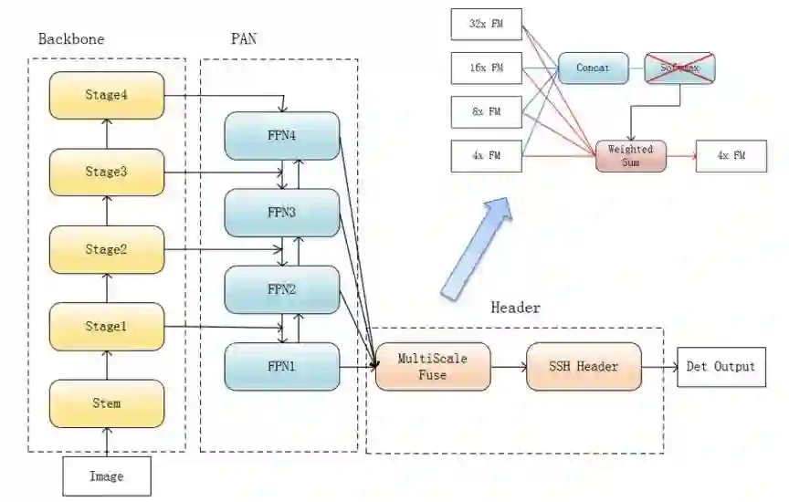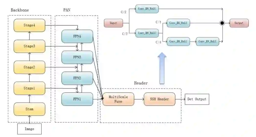 在head的设计上,我们主要引入了两个模块,一个是MultiScale Fuse,另一个是SSH Head。