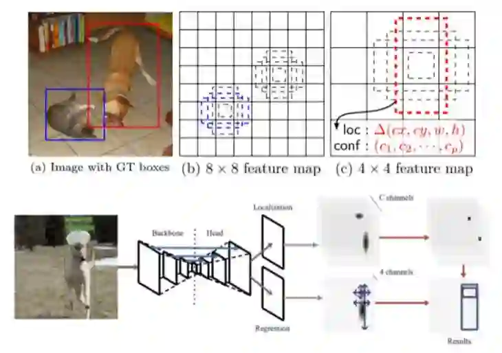 经过上述分析之后,我们认为目前比较适合本次比赛的方法应该是anchor-free的算法,如下图所示,anchor-based算法需要预定义一系列尺度不一,大小不一的anchor,在训练过程中基于这些anchor对目标bbox进行回归预测,而anchor-free算法则是直接从特征图上回归出特定的bbox和类别置信度,流程上更加简练,也避免了很多类似于anchor生成,anchor回归计算的操作,更重要的是后处理阶段会更简单,比如centernet中的后处理操作便可以通过maxpooling层结合一些筛选得到,避免了nms算法影响推理效率的问题。