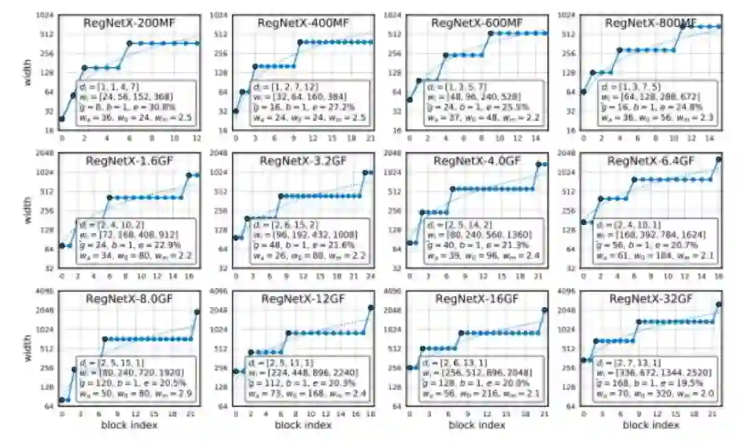 如下图所示,该类型的RegNet遵循了一套计算公式,所以使得我们可以根据目标计算量生成对应的模型结构,最终为了平衡效率和性能,我们选择了RegNetX-400MF作为最终的backbone进行训练。