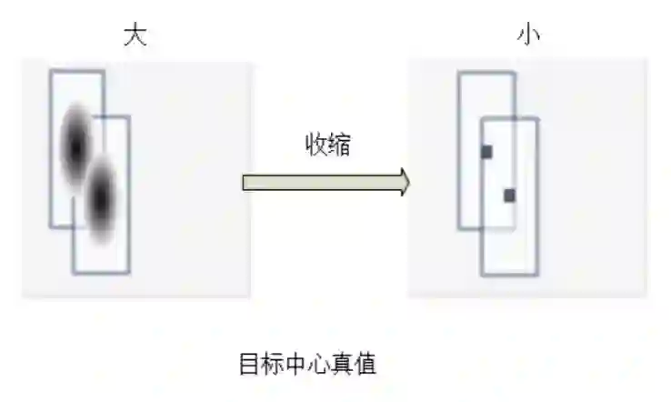 其余的训练技巧还包含了warmup,sgdgc优化器以及SWA训练等常规优化操作,特别的,针对本次采用的anchor-free模型以及F1-Score评价指标,我们对方案中的高斯图生成过程进行了微调,收缩了生成的高斯响应图,一定程度上弱化模型的召回能力,过多的bbox召回在mAP评价指标中影响较小,但是对于F1-Score指标来说影响是比较大的。如下图所示,在两种较为极端的高斯图中间,需要微调得到平衡点。