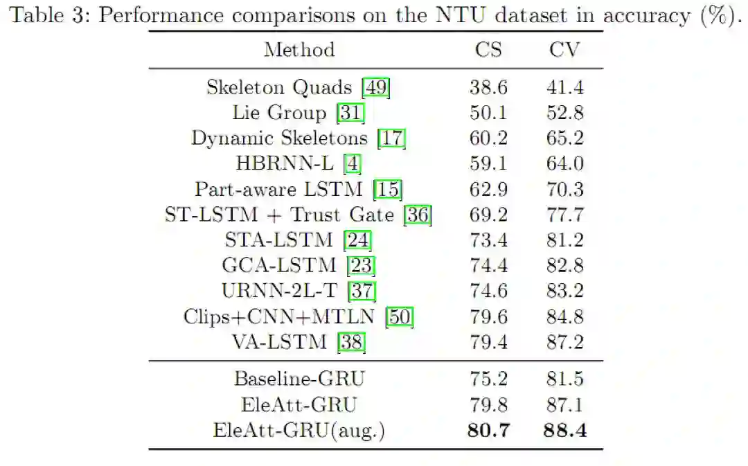 为了检验元素注意力RNN的高效性,我们在基于3D骨架(3D skeleton)数据的行为识别,以及基于RGB的行为识别上分别做了实验。