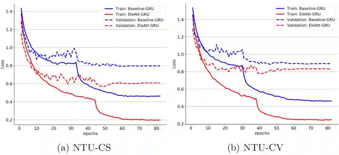 图4 训练时的损失曲线图。该实验分别在NTU数据库的Cross-Subject和Cross-View设置上进行来比较原始GRU(Baseline-GRU)和提出的元素注意力GRU(EleAtt-GRU)的收敛特性。实线表示训练集合上的结果,虚线表示验证集合上的结果。