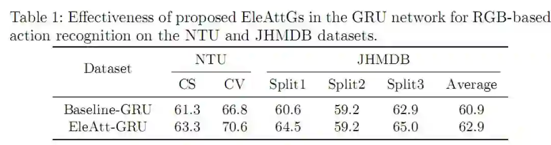 元素注意力RNN层作为一个通用设计,除了3D骨架数据,也可以被用于处理其它数据。在这里,我们通过使用CNN在RGB帧提取的特征作为RNN网络的输入,来验证该注意力机制在CNN特征上仍然有效。表1比较了元素注意力GRU(EleAtt-GRU)和原始GRU (Baseline-GRU)在基于RGB的视频行为识别上的性能,其显示元素注意力GRU比原始GRU识别精度高2%-3.8%。