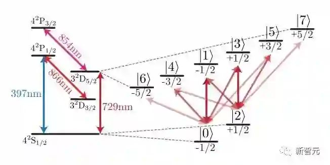 40Ca+ 离子的能级图。量子信息以 S1/2 和 D5/2 状态编码,其中 S 和 D 之间的每个跃迁都可以使用 729nm 的单个窄带激光器访问。