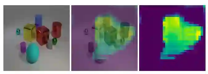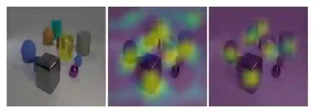 图7. 一个输入图像(左)和Relate[right]模块(右)在紫色圆柱体受到注意时产生的attention mask。当attention mask叠加在输入图像顶部(中图)时,很明显注意力集中在紫色圆柱右侧的区域。