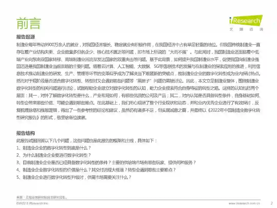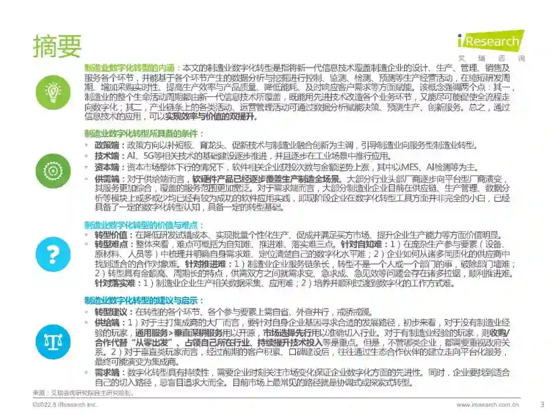 转型难点:整体来看,难点可概括为自知难、推进难、落实难三点。针对自知难:1)在庞杂生产参与要素(设备、原材料、人员等)中梳理并明确自身需求难、定位清楚自己的数字化水平难;2)企业如何从诸多同质化的供应商中找到适合的合作对象难。针对推进难:1)制造业企业服务链条长,转型不是一个人或一个部门的事,破除部门墙难;2)转型具有金额高、周期长的特点,供需双方之间就需求变、急求成、急见效等问题会存在诸多拉锯,顺利推进难。针对落实难:1)制造业企业生产相关数据采集、应用难;2)培养并顺利过渡到数字化的工作方式难。