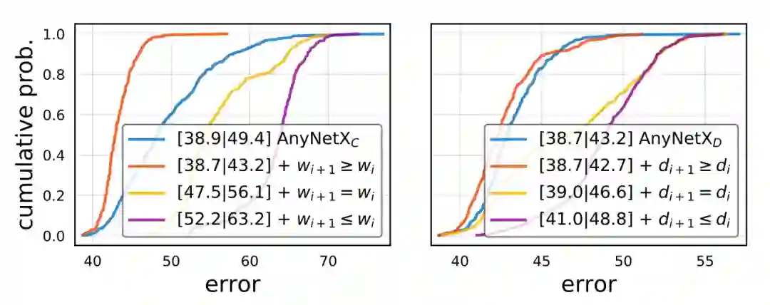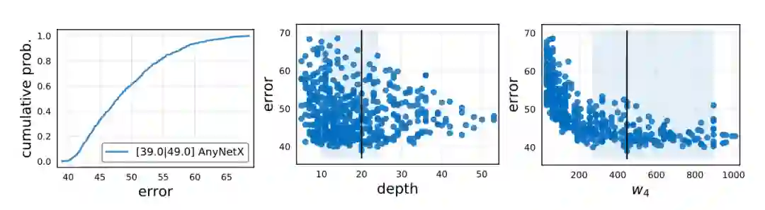 先来看一下设计空间设计的工具,为了评估和对比设计空间,这里使用Radosavovic等人介绍的工具。他提出通过从设计空间采样一组模型,并描述由此产生的模型误差分布,来量化设计空间的质量。这种方法背后的关键是,与使用搜索和比较两个设计空间中的最佳模型相比,比较分布更加可靠且信息更丰富。