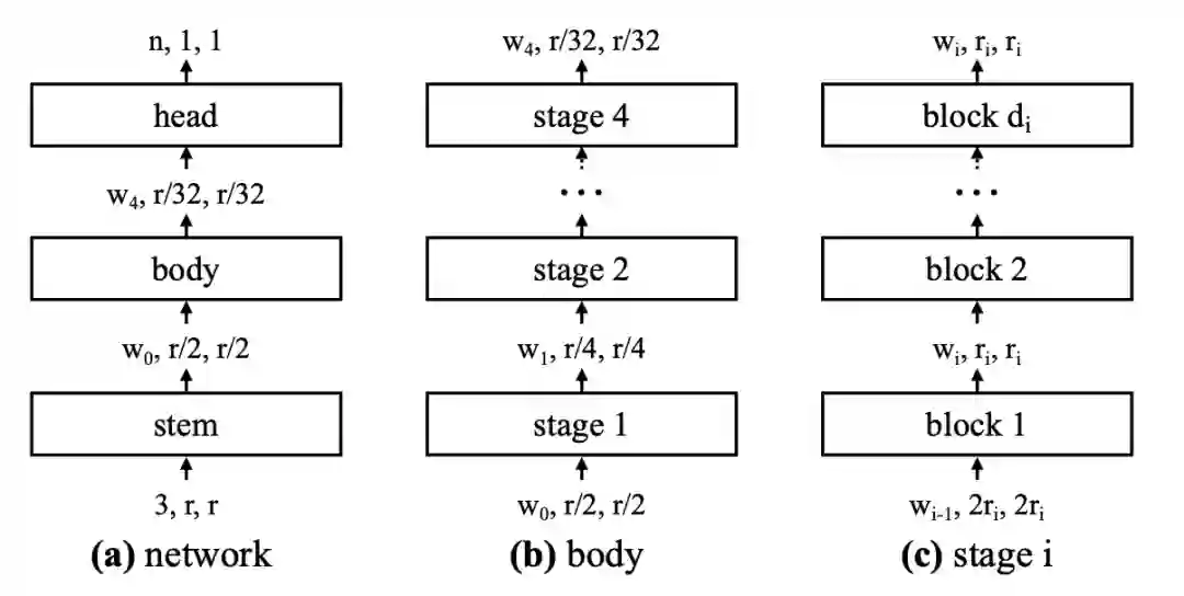 给定输入图像,接下来是一个包含简单主干的网络,再接下来是执行大量计算的网络主体,最后是预测输出类别的网络头。本文保持主干和头部网络尽可能简单,主要关注网络网络主体的结构。可以看到这里网络主体由4个阶段(stage)组成,并且分辨率逐渐降低,然后每个stage里面又是由一系列相同的块(block)组成。在这个结构里面,可以改变的参数包括块的数量