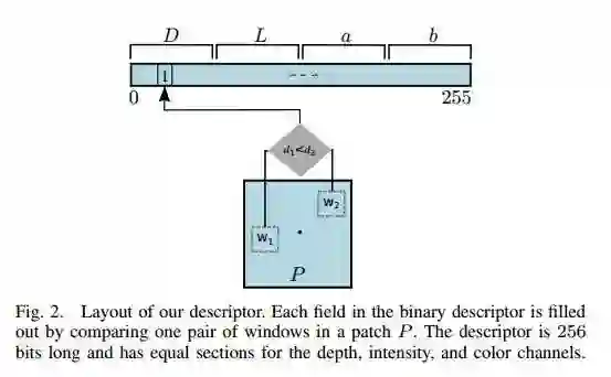图2 描述符的布局。 通过比较补丁P中的一对窗口来填充二进制描述符中的每个字段。描述符有256位并且具有用于深度,强度和颜色通道的相等部分。