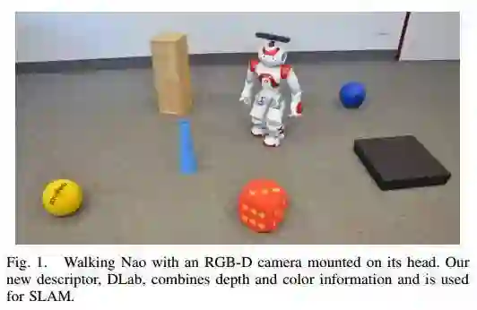 In this paper, we present a visual simultaneous localization and mapping (SLAM) system for humanoid robots. We introduce a new binary descriptor called DLab that exploits the combined information of color, depth, and intensity to achieve robustness with respect to uniqueness, reproducibility, and stability. We use DLab within ORB-SLAM, where we replaced the place recognition module with a modification of FAB-MAP that works with newly built codebooks using our binary descriptor. In experiments carried out in simulation and with a real Nao humanoid equipped with an RGB-D camera, we show that DLab has a superior performance in comparison to other descriptors. The application to feature tracking and place recognition reveal that the new descriptor is able to reliably track features even in sequences with seriously blurred images and that it has a higher percentage of correctly identified similar images. As a result, our new visual SLAM system has a lower absolute trajectory error in comparison to ORB-SLAM and is able to accurately track the robot’s trajectory。