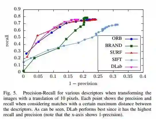 图5 将图像平移10个像素时各种描述符的精度-召回曲线。每个点表明当考虑与描述符之间的特定最大距离的匹配时的精度和召回率。 可以看出DLab表现最佳,因为它具有最高的召回率和精度。