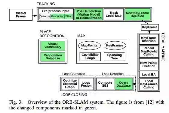 图3 ORB-SLAM系统概述。 该图来自文献[12],更改的组件标记为绿色。