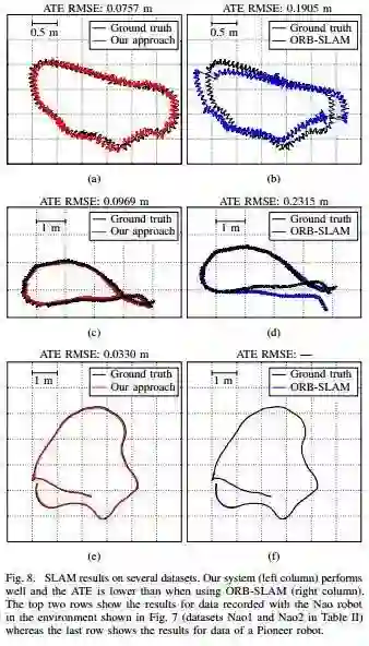 图8 SLAM在几个数据集上产生结果。 我们的系统(左栏)表现良好,ATE低于使用ORB-SLAM(右栏)时的情况。前两行显示了在图7所示环境中用Nao机器人记录的数据结果而最后一行显示了Pioneer机器人的数据结果