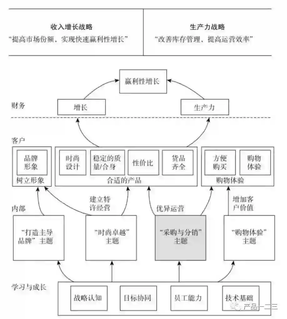 《战略中心型组织》一书中对于一家服装零售公司的战略地图架构绘制如下: