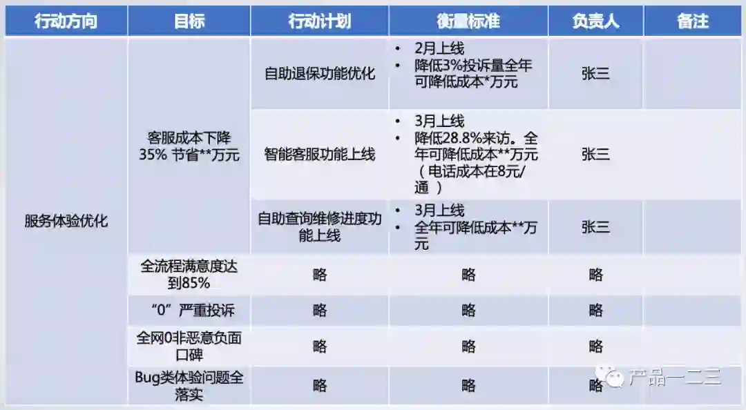 另外选取“服务体验优化”主题向下分解,形成以下的行动计划表: