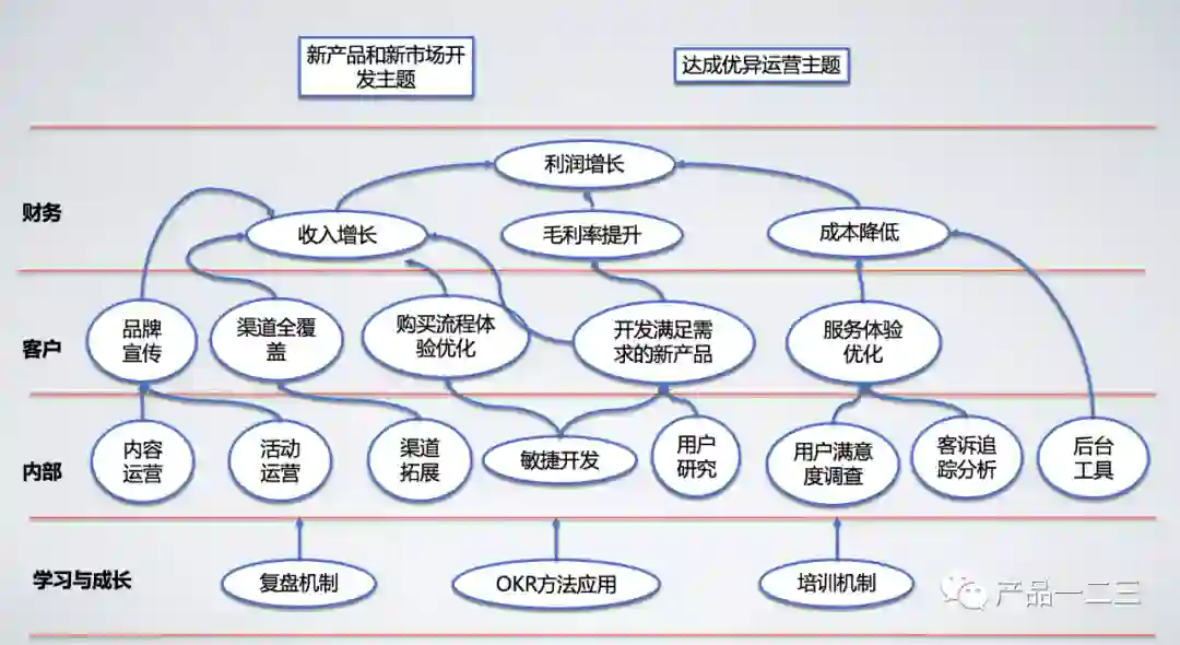 各层之间的要素要有因果关系,可以展示战略主题实现过程中的因果关系,帮助团队成员对战略全局有直观、生动的理解,了解各自对于整体战略的贡献;