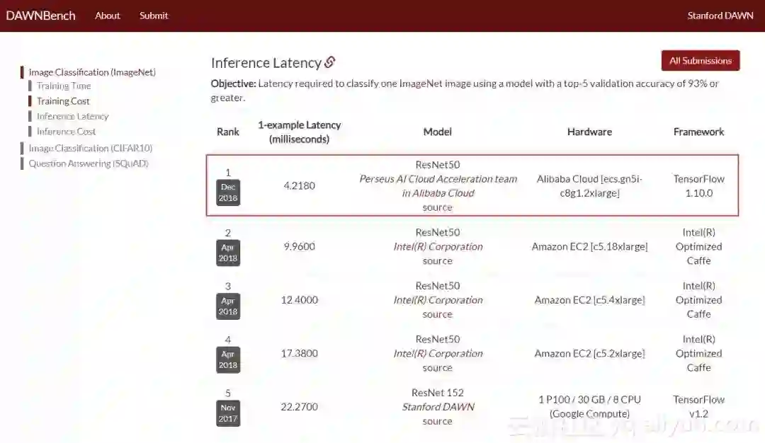图2 DAWNbench竞赛的推理性能榜单(截取日期:2018年12月25日)