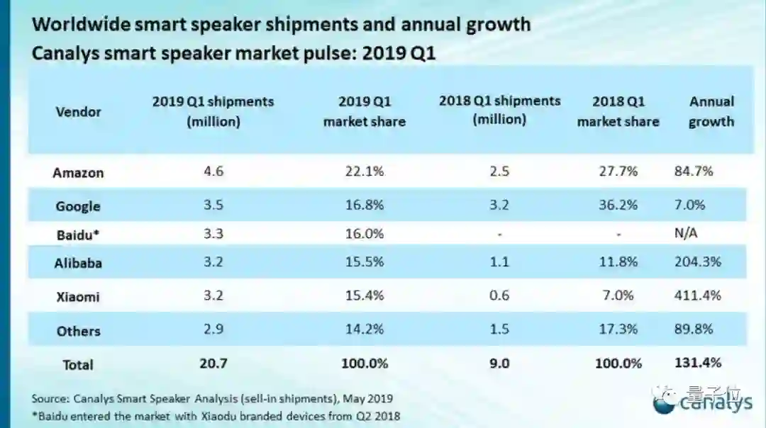 市场分析公司Canalys数据显示,2019第一季度,小度智能音箱的出货量仅次于谷歌及亚马逊,成为中国市场第一,全球市场第三。