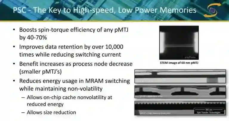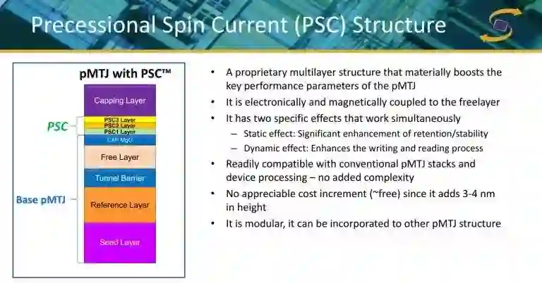 PSC结构一开始就被设计成模块化,可以用任何pMTJ来制造:无论是该公司自己的pMTJ,还是其他来源的pMTJ。PSC结构是在pMTJ沉积过程中制造的,使pMTJ部件的高度增加了约4纳米。该结构与一系列广泛的标准MRAM制造工艺、材料和工具箱兼容,因而任何工厂都能轻松将PSC结构做入到现有的pMTJ部件中,并不显著增加复杂性或制造成本。