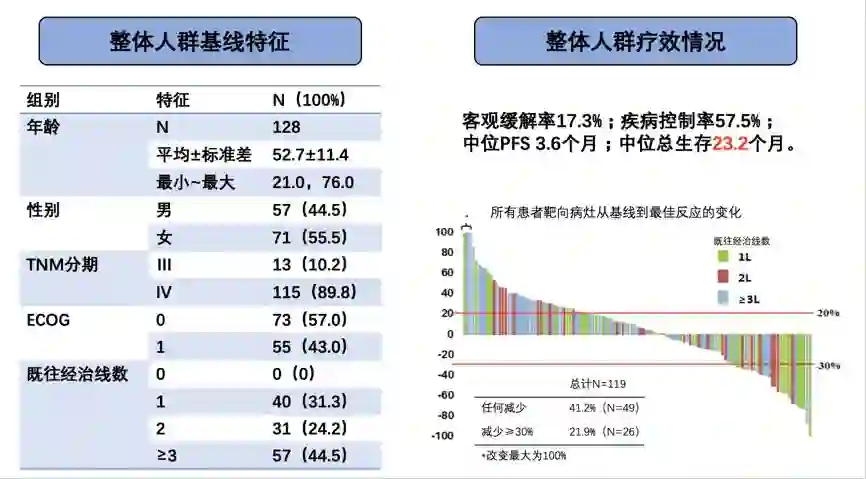 POLARIS-01研究入组二线及二线以上晚期转移性黑色素瘤患者。由北京大学肿瘤医院郭军教授主持,在国内多个黑色素瘤中心共计入组128例患者,其中一线治疗失败的患者是31.3%,二线及二线以上的患者占比68.7%。目前最新的研究数据显示,整体人群中ORR为17.3%,DCR为57.5%,中位PFS为3.6个月,而中位OS为23.2个月(图4)。