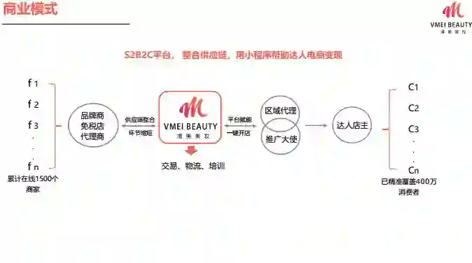 做供应链赋能、SaaS赋能、服务赋能、学习赋能、培训赋能以及商业赋能等,把这些都赋能给小B(注:小B就是唯美美妆平台上的美妆达人)。