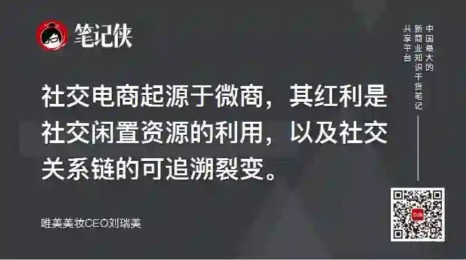 这种以小B为中心的社交电商起源于微商,社交电商的红利是社交闲置资源的利用,以及社交关系链的可追溯裂变。