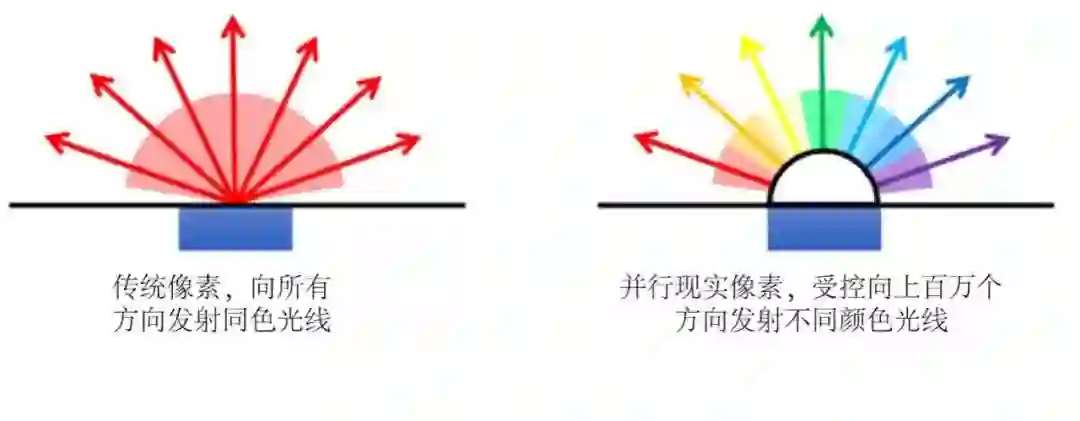 以上场景乍一听似乎难以置信,但该公司研发的技术已经很接近这些目标。并行显示技术的关键是“多视像素”。传统像素向各个方向发射单一颜色的光,而多视像素可以向数千乃至数百万个方向发射不同颜色的光。