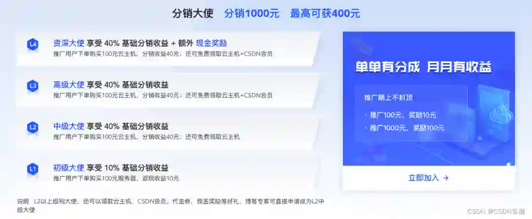 加入推广计划,成为CSDN开发云的合伙人,点此成为分销大使,最高可享受 40%的分销收益,还有云主机、CSDN会员、现金奖励等额外权益,博客专家可直接申请成为L2中级大使。