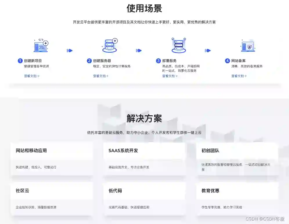 CSDN开发云背靠CSDN社区海量的数据资源,提供专业的开源项目及其文档,依托丰富的基础云服务,覆盖创建新项目、创建服务器、部署服务、网站备案等多场景,提供网站和移动应用、SaaS系统开发、初创团队、社区云、低代码开发、教育优惠等多样化解决方案。