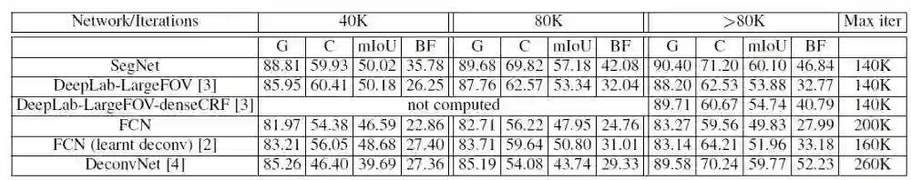 获得最高的全局平均准确度(G),类别平均准确度(C),mIOU和边界F1测量(BF)。它的结果优于FCN,DeepLabv1和DeconvNet。