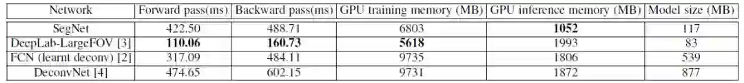 SegNet在训练和测试期间的内存要求都很低。并且模型尺寸比FCN和DeconvNet小得多。