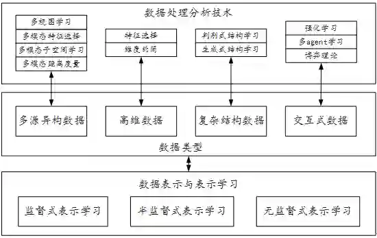 下面主要对数据科学中的机器学习技术研究进展进行介绍,包括数据表示与表示学习、高维数据学习、多源异构数据学习、结构学习以及交互数据学习等五个方面。图3中给出了数据分析技术与数据类型之间的相互关系。