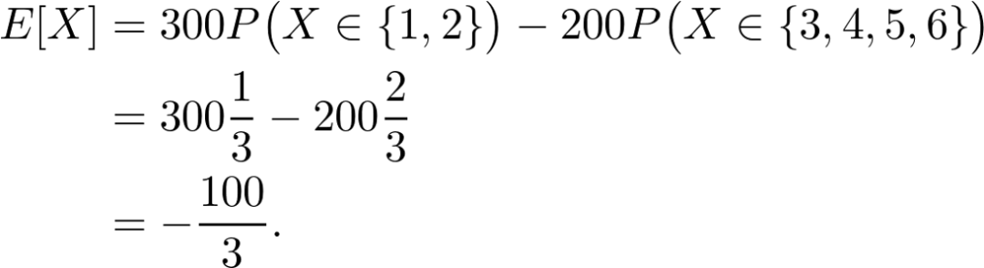 假设你和朋友玩游戏。你掷一个经典的六边形骰子,如果结果是 1 或 2,你将赢得 300 美元。否则,你就输 200 美元。如果你玩这个游戏的时间够长,你每轮的平均收入是多少?你应该玩这个游戏吗?