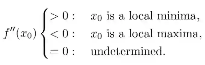微分可以用来优化函数:导数在局部极大值和极小值处为零。(也有例外,例如:f(x) = x³,x=0),导数为零的点称为临界点。临界点是最小值还是最大值可以通过查看二阶导数来确定: