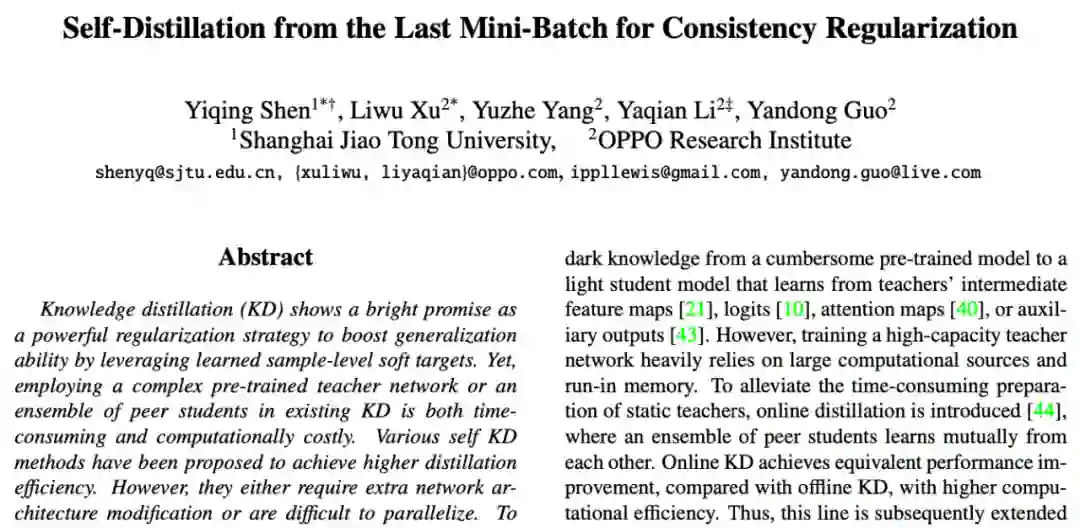 近日, OPPO 研究院联合上海交通大学将视角聚焦到知识蒸馏的范式本身,提出了新的自蒸馏框架:DLB(Self-Distillation from Last Mini-Batch),模型无需额外的网络架构修改,对标签噪声具有鲁棒性,并大幅节约训练的空间复杂度。此外,在三个基准数据的实验中,模型达到了 SOTA 性能。相关论文「Self-Distillation from the Last Mini-Batch for Consistency Regularization」已被 CVPR 2022 收录。